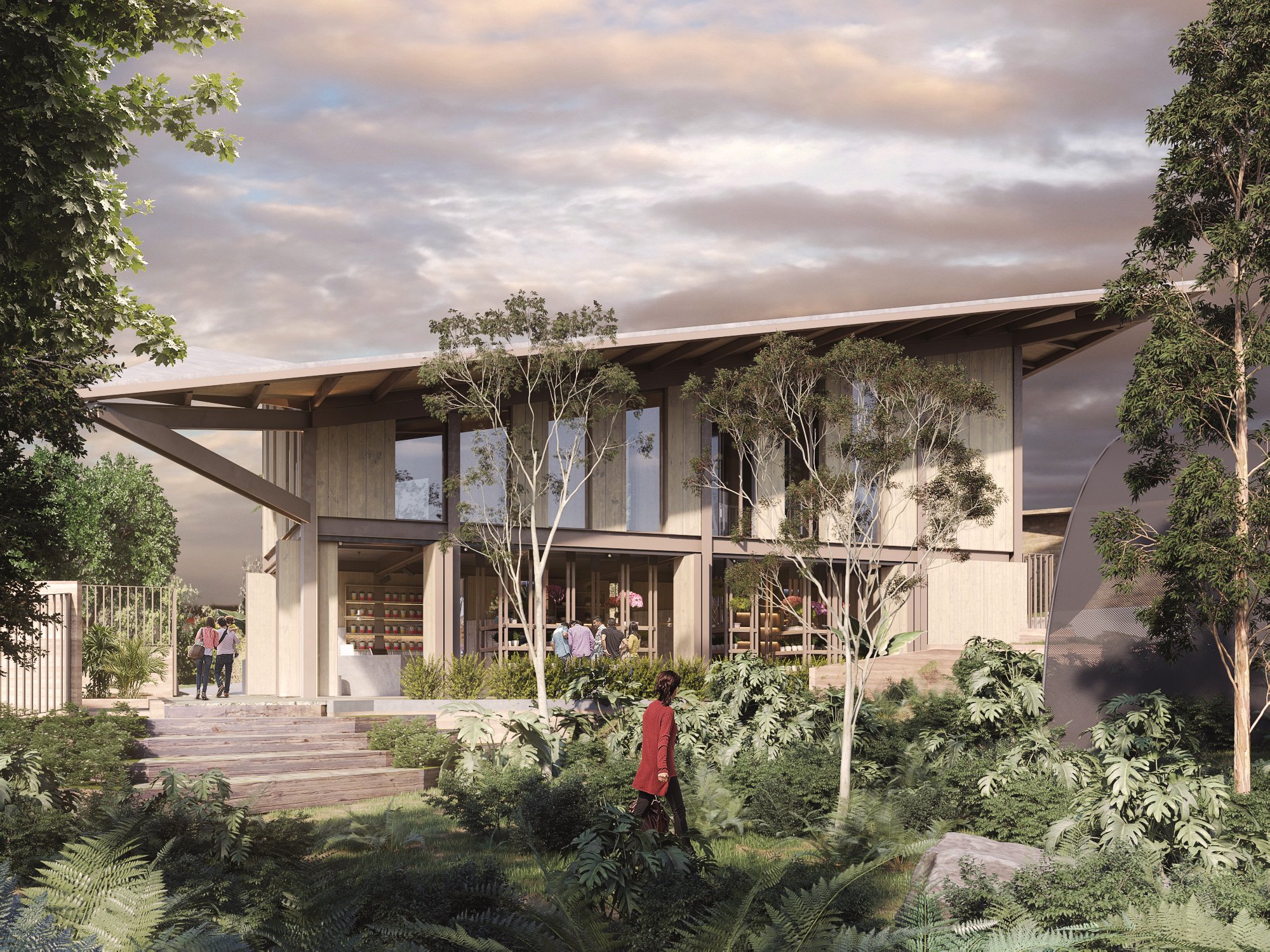 El proyecto busca crear un espacio para exhibir, apreciar y adquirir especies y productos botánicos. Como resultado, una pieza arquitectónica de geometría angular y materialidad natural que se mezcla con los elementos del lugar.